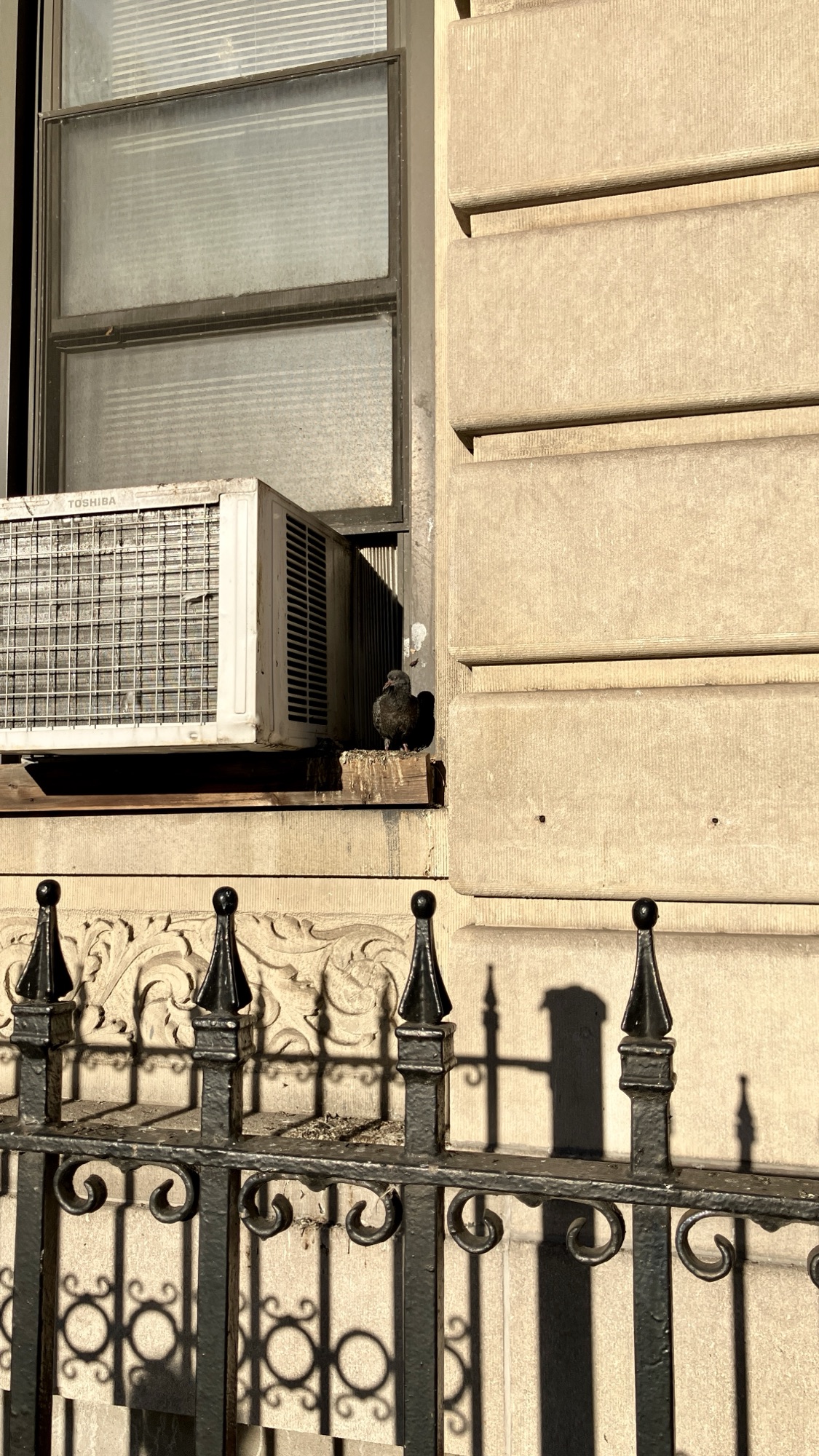 My son and I have recently become interested in the nesting habits of pigeons. Before we moved to the city, a friend of ours told us that baby pigeons, called squabs, are rarely seen in urban settings. This lack of access to the cuteness that infancy affords to baby birds causes city dwellers to have lower levels of affinity for pigeons, she said. Odd, that just a few weeks after our move to Manhattan, we began to notice a growing pigeon baby tucked in a window nest next to an air conditioning unit. For weeks, on our walk to school in the morning, we watched the squab grow in plain view, until one day, it jumped down to a ledge beneath its birthplace and then onward to mix in as an undistinguishable member of the crowds of other adult pigeons nearby.